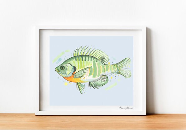 Bluegill Print - Fish Lake River Beach Mountain Lodge Cabin Decor Painting Print (Reef Blue)